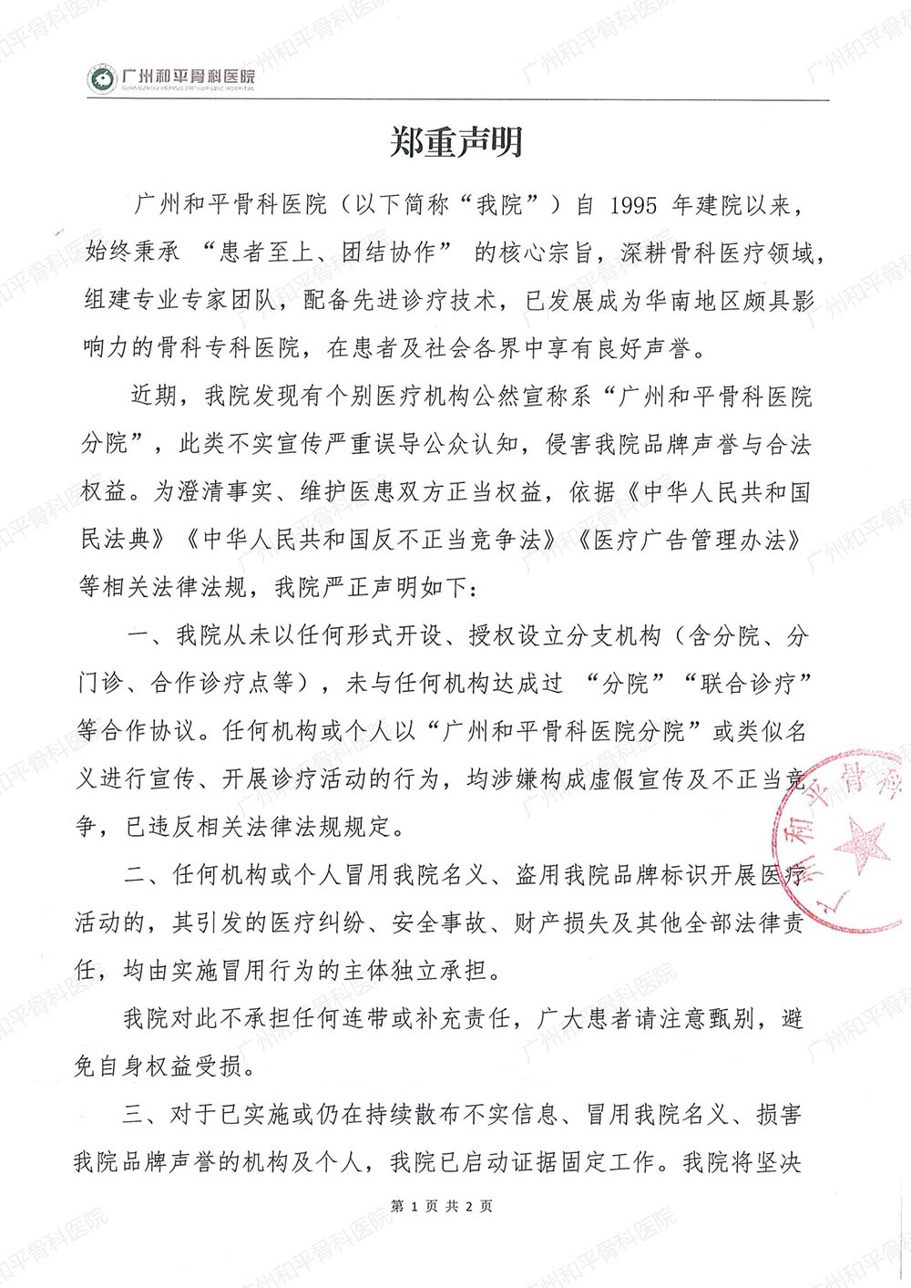 近期,我院发现有个别医疗机构公然宣称系“广州和平骨科医院分院”,此类不实宣传严重误导公众认知,侵害我院品牌声誉与合法权益。为澄清事实、维护医患双方正当权益,依据《中华人民共和国民法典》《中华人民共和国反不正当竞争法》《医疗广告管理办法》等相关法律法规,我院严正声明如下: